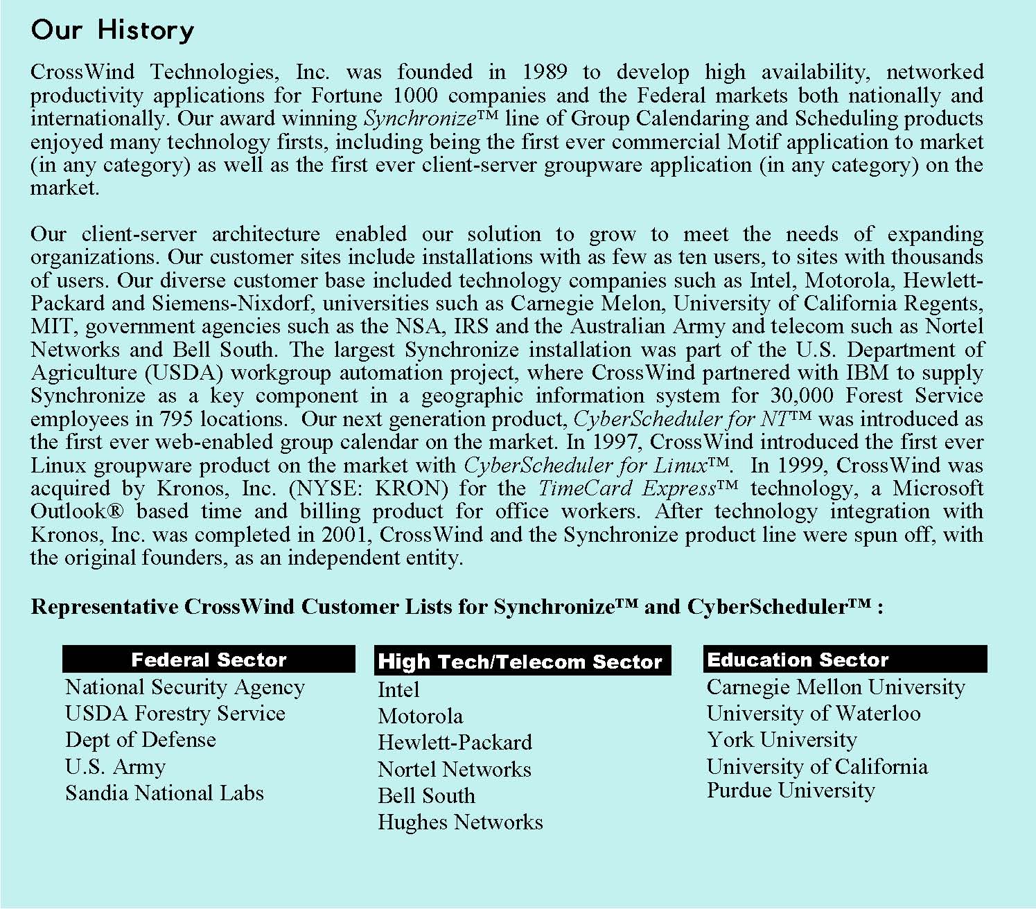 Since 2006, we have focused on the law enforcement market. Law enforcement agencies are currently facing a rapidly changing information landscape armed with decades-old software technology. Webelieve that our technology will provide a many-fold improvement on operations efficiency at half the price of current solutions. More importantly, it will provide law enforcement agencies the ability to stay ahead of the technology curve.